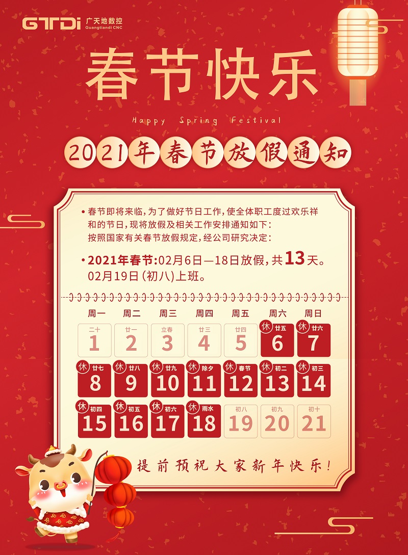 2021年春节将至,首先感谢您在2020年里的鼎力支持和愉快合作,DB电竞(DBGame)数控全体同仁在此给您拜个早年。在新年的一年里,DB电竞将更加努力,为您提供更优质的服务。按照国家春节放假规定结合我司的具体情况,春节放假时间安排如下: