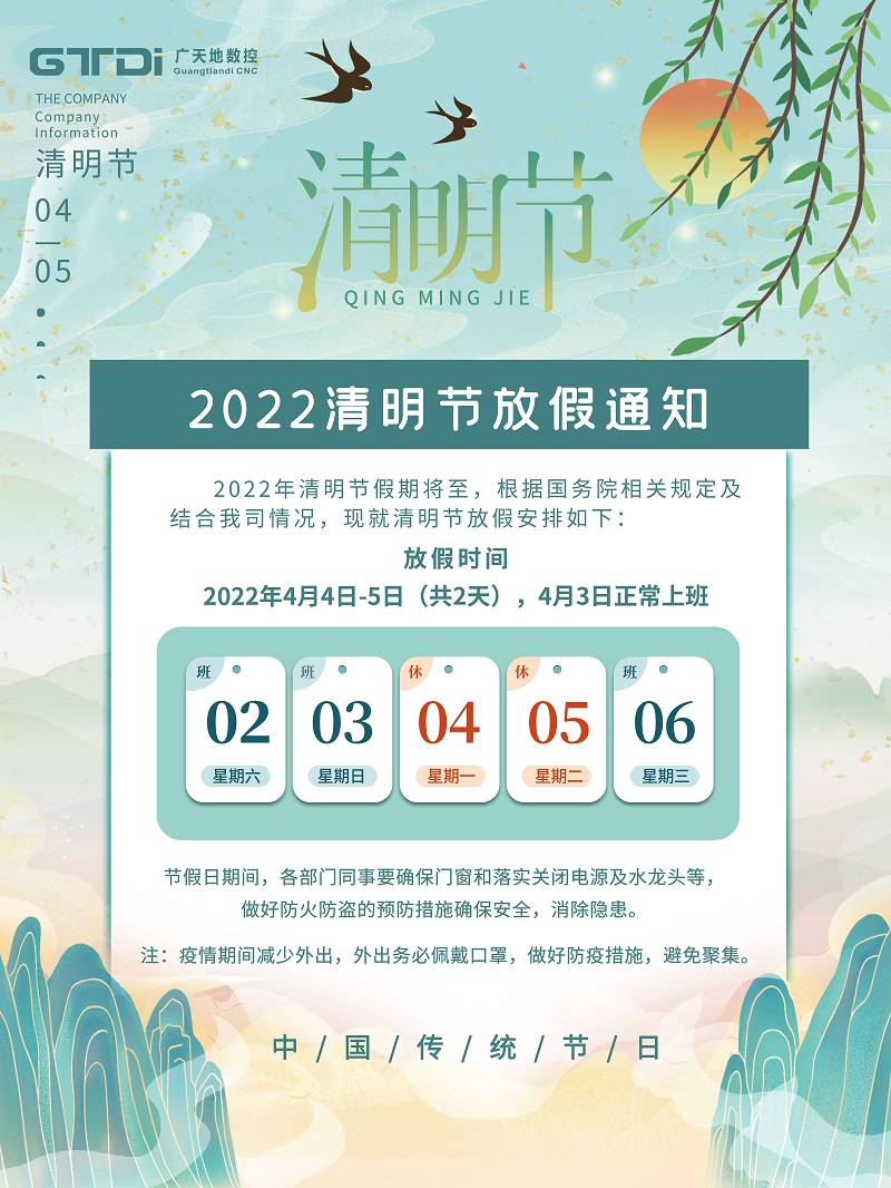 根据国务院办公厅《关于2022年部分节假日安排的通知》,并结合我司实际情况,DB电竞(DBGame)数控2022年清明节放假安排如下:
